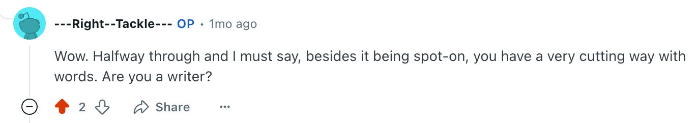— apatheticBird, Reddit comment on The Zaddy Split: A Mid-Divorce PPL Routine“You sound on fire 🔥 The cons are real, but I think you have the passion to overcome.”