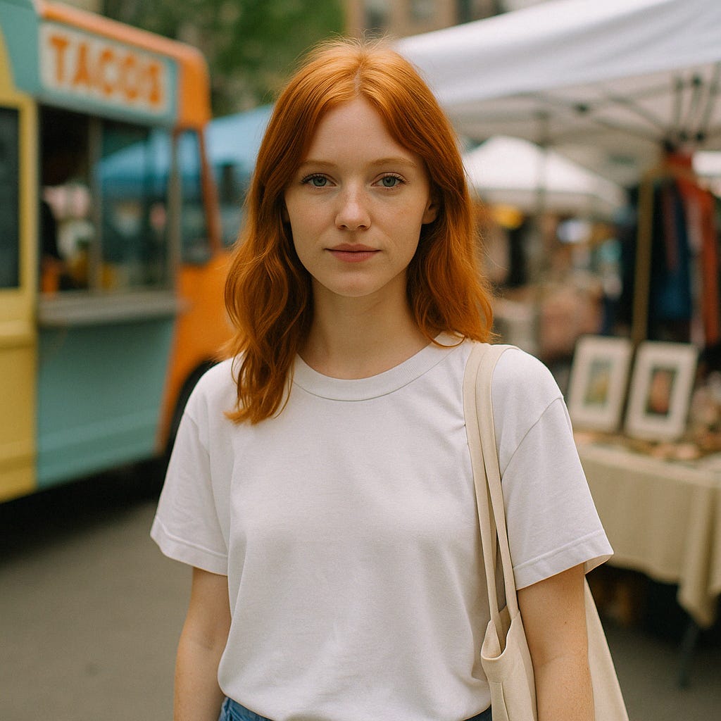 As I walked toward my apartment, I noticed an art market across the streetāclothing stalls, framed paintings, handmade jewelry, a taco truck. I wandered through and spotted a cute, slender redhead in a baggy white t-shirt and tote bag tossing her paper plate in the trash.